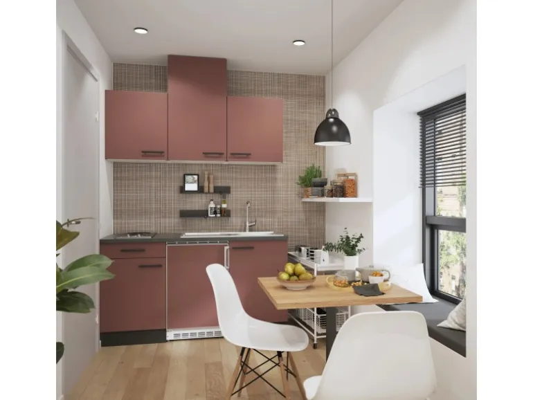 Die Serie Nizza407 ist mit der Kombination aus Frontfarbe in Rostrot mit Korpus und Arbeitsplatte in Anthrazit Matt perfekt abgestimmt. Metallgriffe in Schwarz Matt runden den Look ab und machen Ihre Küche zu einem echten Hingucker.