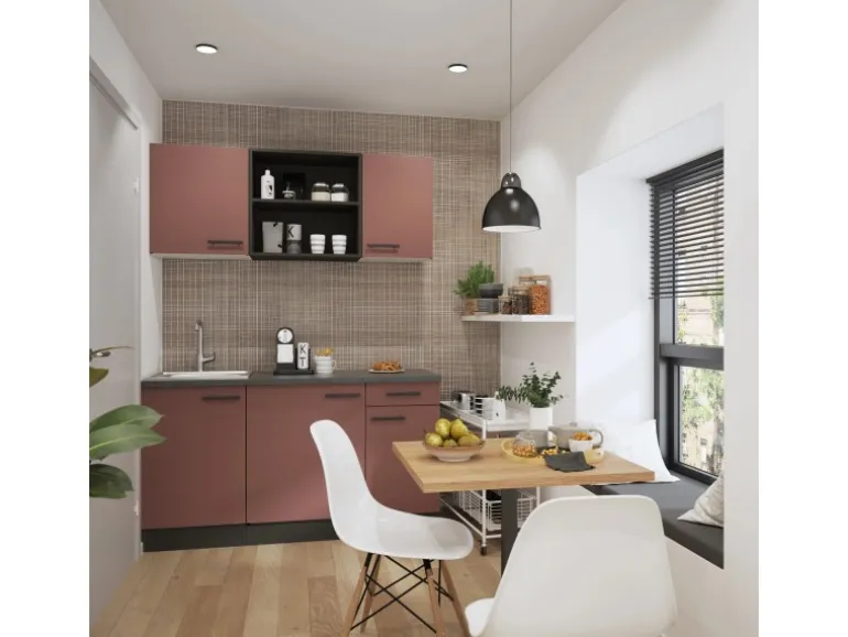 Die Serie Nizza407 ist mit der Kombination aus Frontfarbe in Rostrot mit Korpus und Arbeitsplatte in Anthrazit Matt perfekt abgestimmt. Metallgriffe in Schwarz Matt runden den Look ab und machen auch den kleinsten Raum mit dieser Küche zu einem Hingucker.