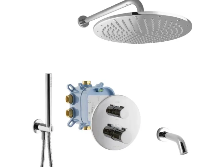 Die Armatur wird in der Standardkonfiguration mit einer 3-Wege Blende (Kopfbrause / Handbrause / Wanneneinlauf) ausgeliefert. Für die Nutzung von drei Verbrauchern muss der Unterputz Grundkörper entsprechend angeschlossen werden.- Aus massivem Messing