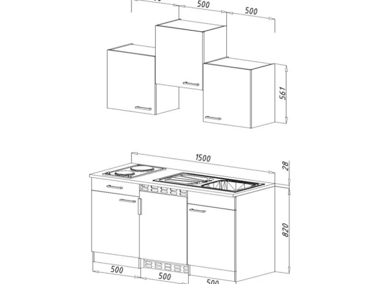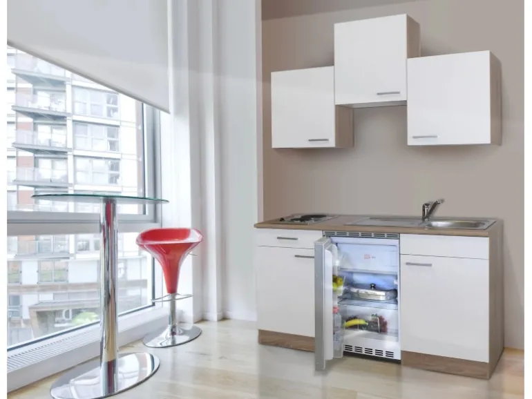 Mit einer Gesamtbreite von 150 cm ist die Küche ideal für das Büro, die Single- oder Studentenwohnung. Der Unterschrank mit Schublade und die drei Oberschränke bieten genügend Platz für Gläser und Geschirr.