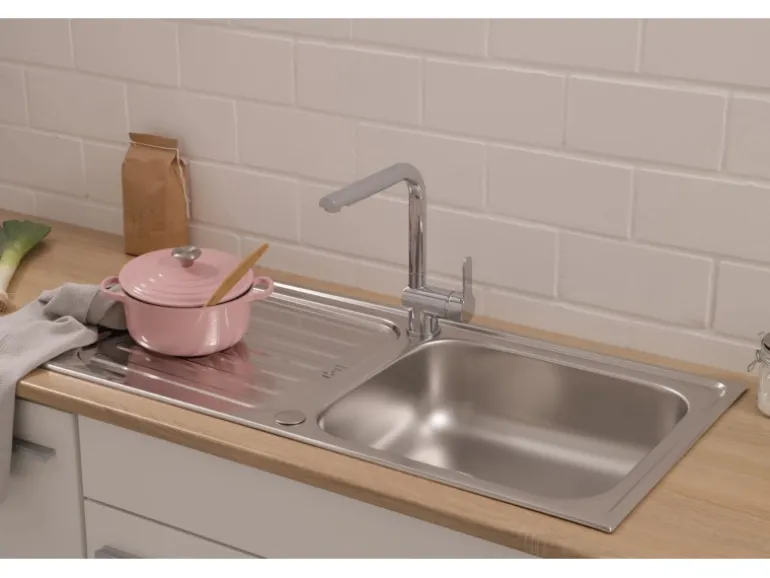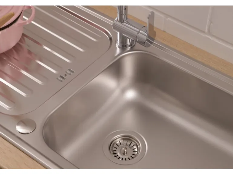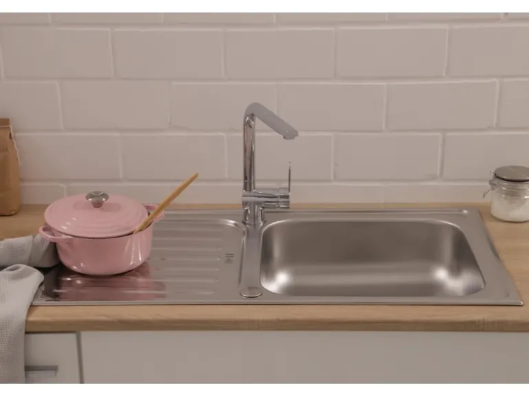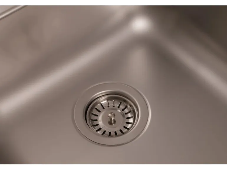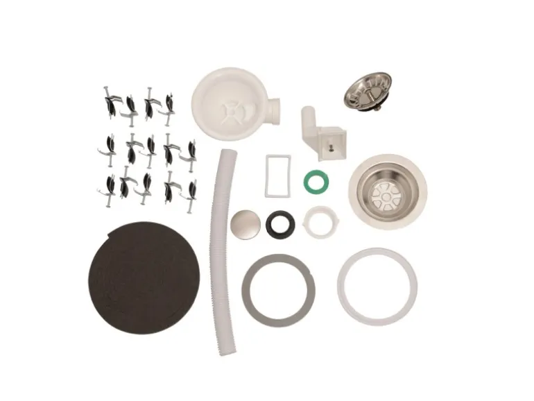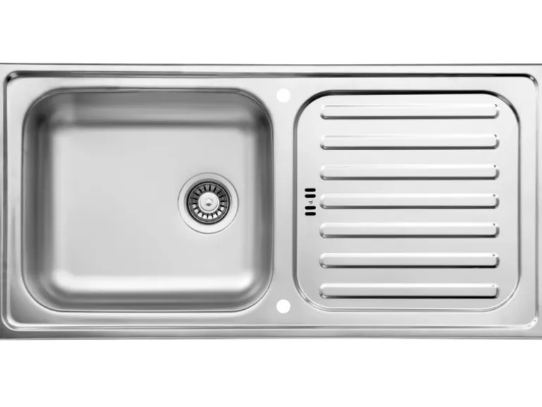 Im Lieferumfang der Einbauspüle sind eine Ab- und Überlaufgarnitur, Fixierklemmen, sowie eine Montageschablone zum sofortigen Einbau enthalten. Die Spüle verfügt über 2 Hahnlöcher, die bereits durchgestoßen sind, sowie eine praktische Hahnlochabdeckung. Der Ablauf ist mit einem Siebkorb von 9 cm ausgestattet.