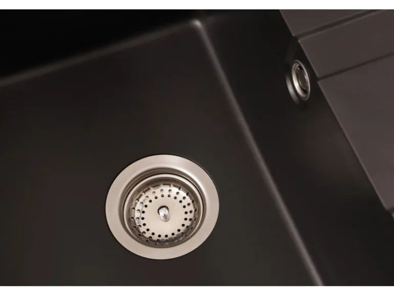 Im Lieferumfang der Einbauspüle sind eine Ab- und Überlaufgarnitur, Fixierklemmen, sowie ein Drehexcenter enthalten. Die Hahnlöcher sind nicht durchstoßen. Der Ablauf ist mit einem Siebkorb von 9 cm ausgestattet.