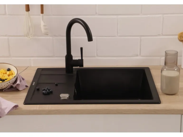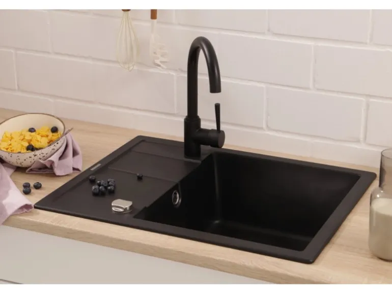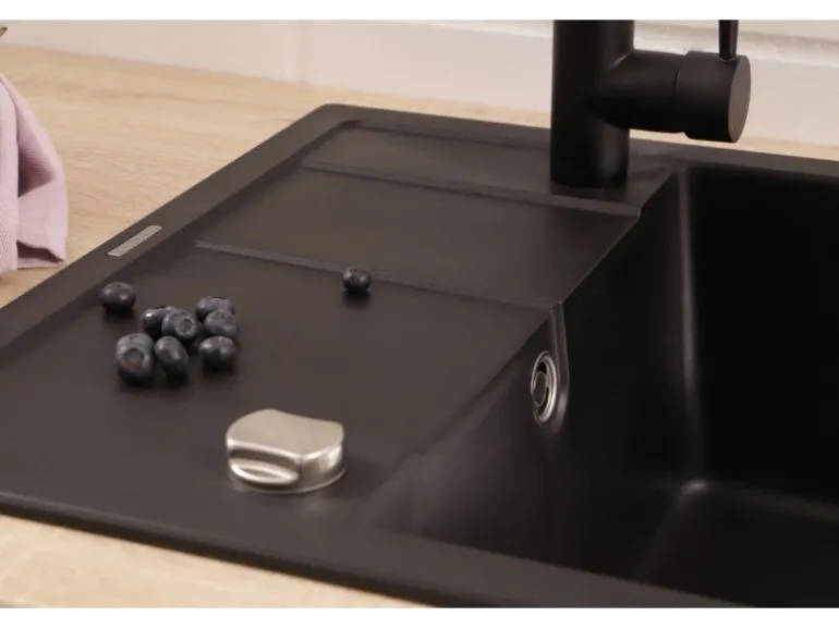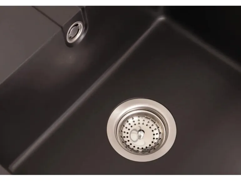 Die Respekta Granitspüle Nashville in Schwarz kommt mit einer Breite von 65 cm und einer Tiefe von 50 cm und ist durch die hochwertige Verarbeitung und das edle Design die ideale Ergänzung für die moderne Küche von Heute. Die besonders leicht zu reinigende Oberfläche hat eine Temperaturbeständigkeit von bis zu 180 °C und weist zudem eine hohe Resistenz gegenüber aggressiven Chemikalien auf. Mit einer Beckentiefe von 17,5 cm bietet sie ausreichend Raum für verschiedene Aufgaben in der Küche.