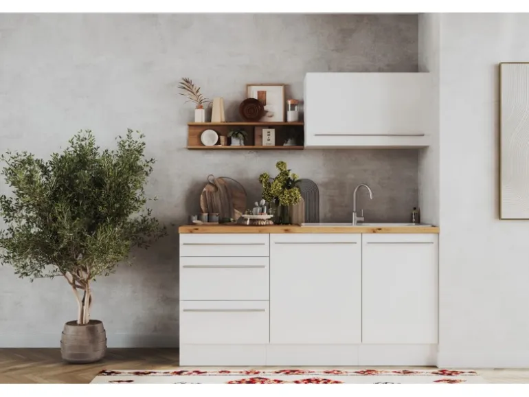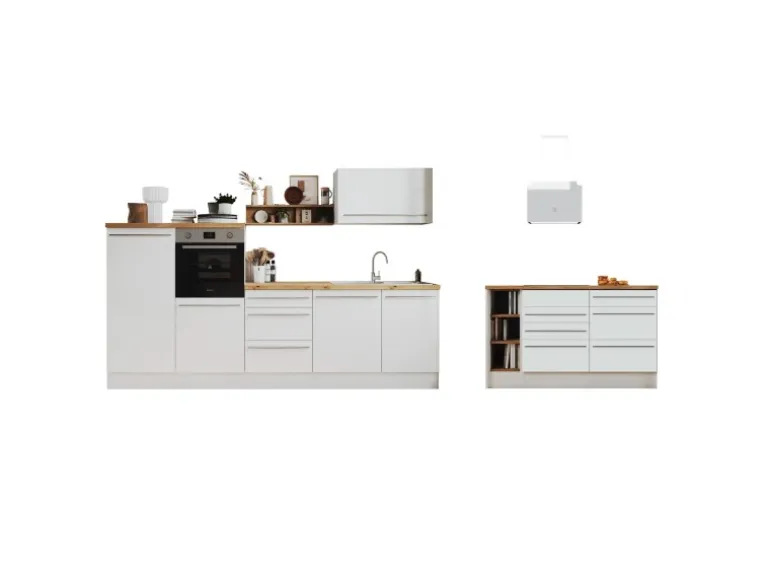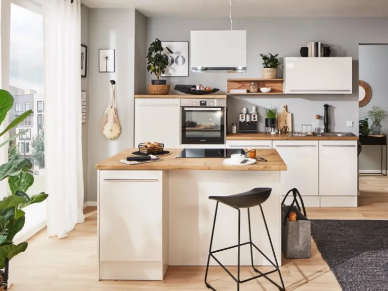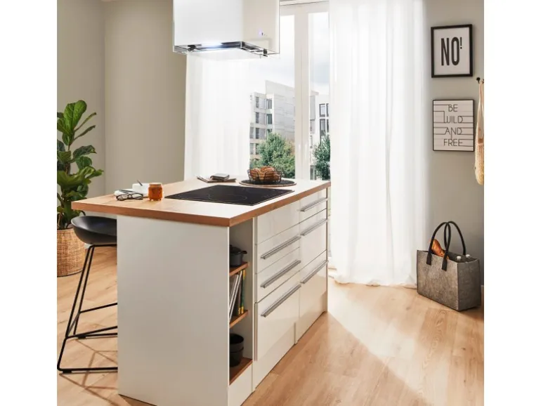 Die Gabriel Küchen Familie hat eine Erweiterung erhalten: Die Küchenzeilen mit einer Breite von 290 cm oder 320 cm sind jetzt auch mit einer Kücheninsel erhältlich. Es gibt zwei Varianten der Gabriel Inselküchen. Bei der ersten Variante sind alle Elektrogeräte in der Zeile eingebaut, während die Insel als zusätzliche Arbeitsfläche dient. Die zweite Variante verfügt über eine Insel, die mit einem autarken Backofenset und einer Inselhaube ausgestattet ist. Dieses Set besteht aus einem Backofen und einem Induktionskochfeld, das je nach Küchengröße in einer Breite von 59 cm oder 77 cm erhältlich ist. Zusätzlich gibt es eine Inselküche, bei der eine Kochfeldhaube in die Insel installiert ist. Unabhängig von der Variante kann die Insel wechselseitig aufgebaut werden. Sie lässt sich je nach Bedarf mit der einen oder anderen Seite nach vorne ausrichten, was eine individuelle Anpassung an den jeweiligen Küchenraum ermöglicht. Die Zeile kann zudem als Doppelblock montiert werden, was zusätzliche Flexibilität bei der Küchenplanung bietet. Die Gabriel Küchen Familie ist mit Soft-Close Scharnieren ausgestattet und bietet höchsten Bedienkomfort sowie eine lange Lebensdauer.