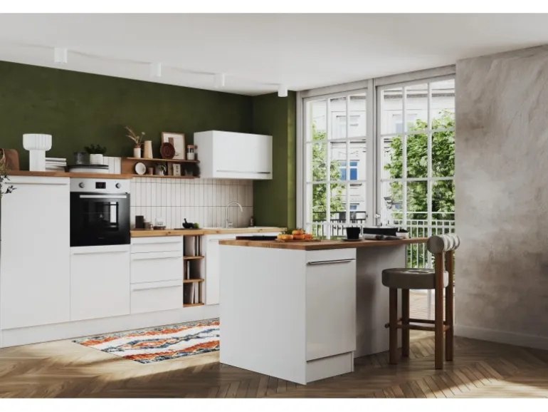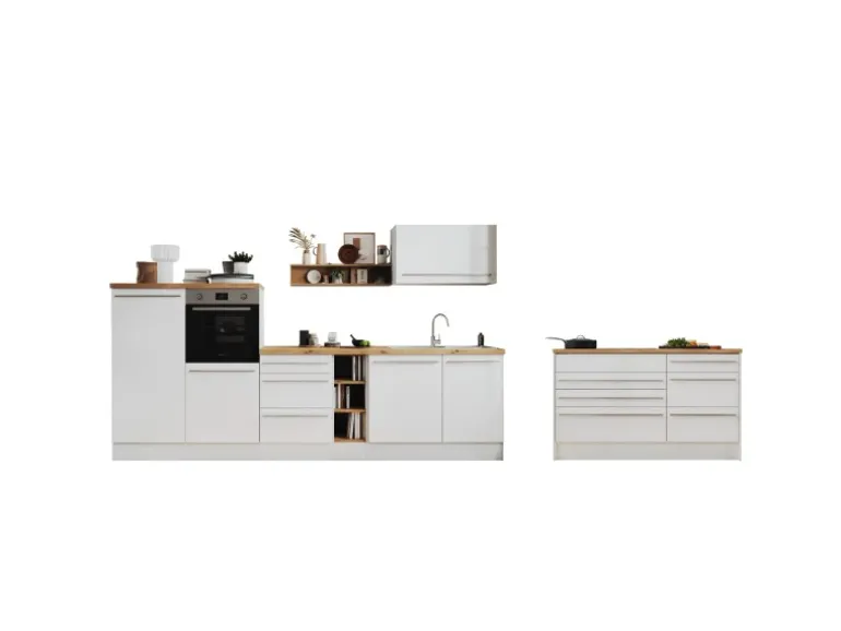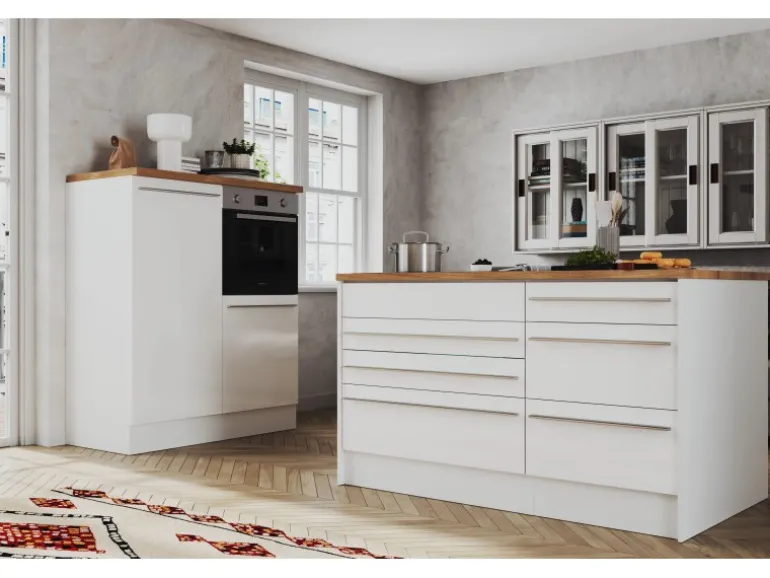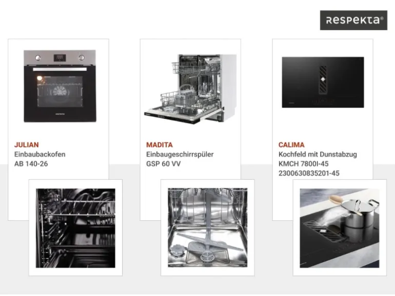 Mit Einbaubackofen EEK: A und Glaskeramikkochfeld, Inselhaube EEK: A++, Einbaugeschirrspüler EEK: E, Einbaukühlschrank EEK: E