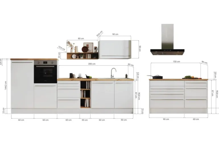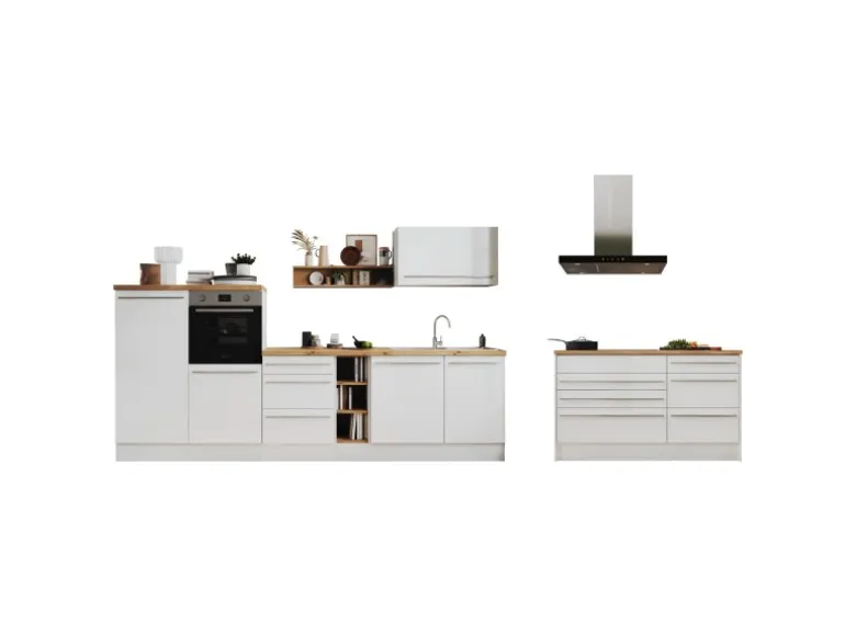 Die Gabriel Küchen Familie hat eine Erweiterung erhalten: Die Küchenzeilen mit einer Breite von 290 cm oder 320 cm sind jetzt auch mit einer Kücheninsel erhältlich. Es gibt zwei Varianten der Gabriel Inselküchen. Bei der ersten Variante sind alle Elektrogeräte in der Zeile eingebaut, während die Insel als zusätzliche Arbeitsfläche dient. Die zweite Variante verfügt über eine Insel, die mit einem autarken Backofenset und einer Inselhaube ausgestattet ist. Dieses Set besteht aus einem Backofen und einem Induktionskochfeld, das je nach Küchengröße in einer Breite von 59 cm oder 77 cm erhältlich ist. Zusätzlich gibt es eine Inselküche, bei der eine Kochfeldhaube in die Insel installiert ist. Unabhängig von der Variante kann die Insel wechselseitig aufgebaut werden. Sie lässt sich je nach Bedarf mit der einen oder anderen Seite nach vorne ausrichten, was eine individuelle Anpassung an den jeweiligen Küchenraum ermöglicht. Die Zeile kann zudem als Doppelblock montiert werden, was zusätzliche Flexibilität bei der Küchenplanung bietet. Die Gabriel Küchen Familie ist mit Soft-Close Scharnieren ausgestattet und bietet höchsten Bedienkomfort sowie eine lange Lebensdauer.