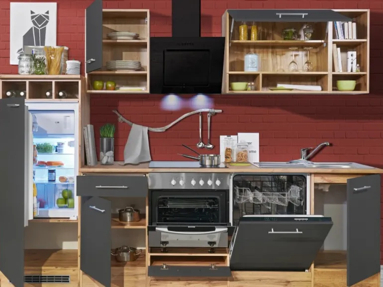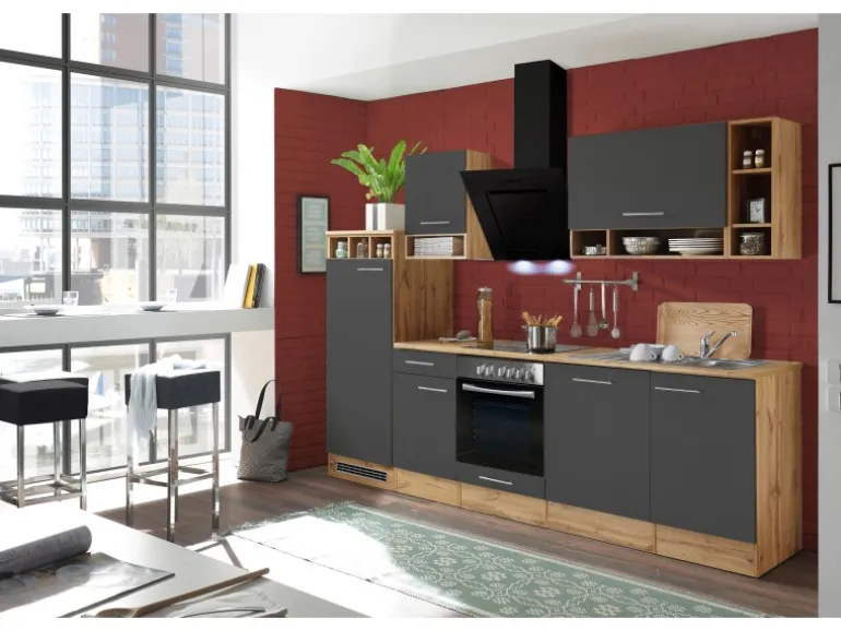Die Respekta Küchenzeile ist mit einer Breite von 280 cm perfekt mittlere Räume und eignet sich ideal für Familien. Bestehend aus unter anderem je einem 50 cm und einem 80 cm breiten Hängeschrank, einem Herdumbauschrank mit Klapptür und einem Unterschrank mit Schublade bietet diese Küche ausreichend Platz für all Ihre Küchenutensilien.