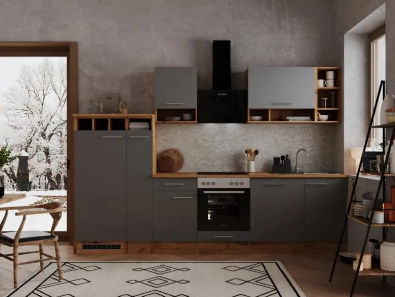 Die Respekta Küchenzeile ist mit einer Breite von 310 cm ideal für Familien. Bestehend aus unter anderem je einem 50 cm und einem 80 cm breiten Hängeschrank, einem Herdumbauschrank mit Klapptür und einem Unterschrank mit Schublade bietet diese Küche ausreichend Platz für all Ihre Küchenutensilien. Ein besonderes Highlight dieser Küche ist der trendige Apothekerschrank. Er ist von beiden Seiten zugänglich und wirkt wie ein kleines Raumwunder. Mit einer Breite von 30 cm und drei Innenfächern schafft er viel übersichtlichen Stauraum für Ihre Vorräte.