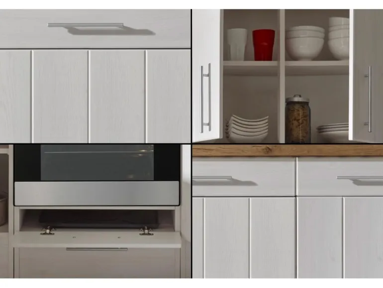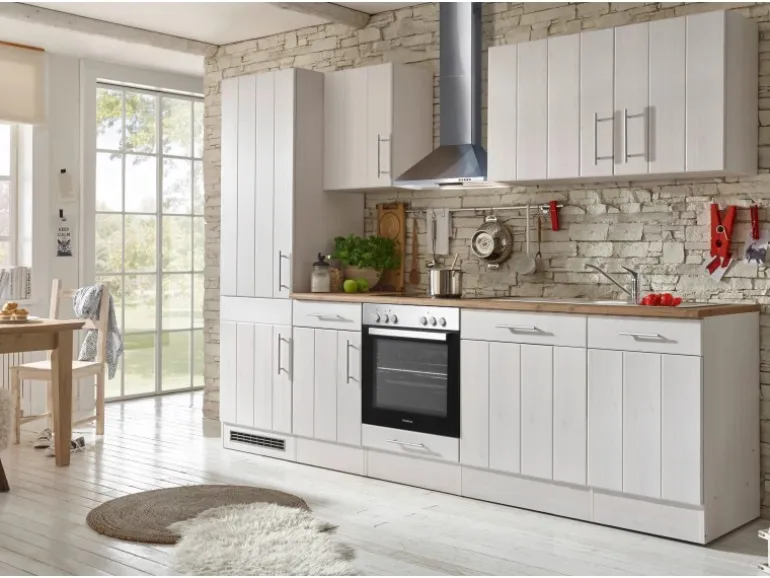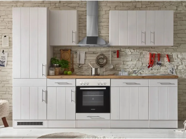 Die Respekta Küchenzeile Anton kombiniert ein zeitlos modernes Design im Landhausstil mit hohem Komfort und Funktionalität. Die Küche vereint die schlichte Eleganz nostalgischer Formen mit der wohnlichen Wärme hölzerner Farbtöne und avanciert zu einem optischen Highlight in Ihren Räumen. Die Fronten und Korpusse in Lärche Weiß matt werden durch die Arbeitsplatte in Wildeiche akzentuiert.