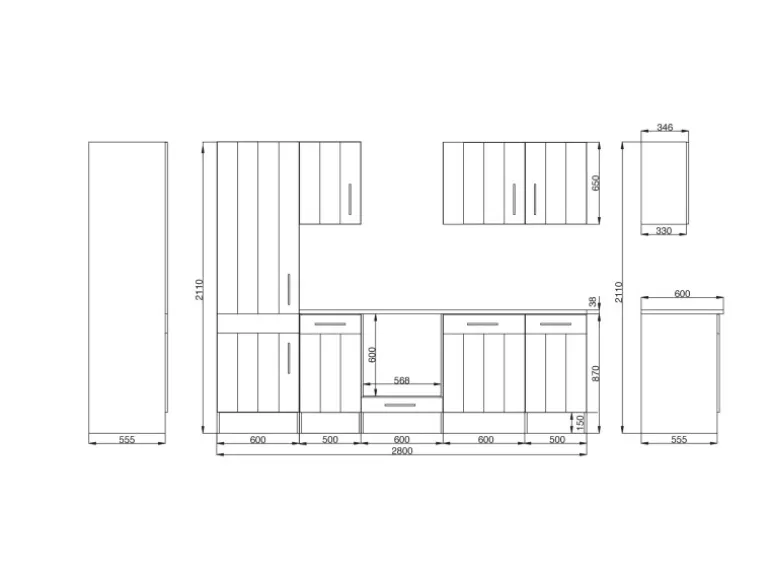 Die Respekta Küchenzeile besteht aus (H x B x T):