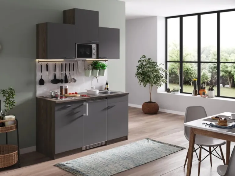 Drei Oberschränke sowie Unterschränke und Schubladen bieten viel Stauraum für Ihre Küchenutensilien und Vorräte. Das Domino-Kochfeld mit zwei Kochzonen, ein Einbaukühlschrank mit drei Sterne Gefrierfach und die Edelstahl Einbauspüle machen die Küchenzeile zum geschmackvollen und funktionellen Einrichtungselement auf kleinem Raum.