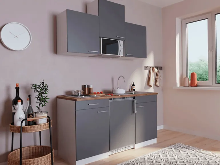 Mit einer Gesamtbreite von 150 cm ist die Küche ideal für das Büro, die Single- oder Studentenwohnung. Der Unterschrank mit Schublade und die drei Oberschränke bieten genügend Platz für Gläser und Geschirr.