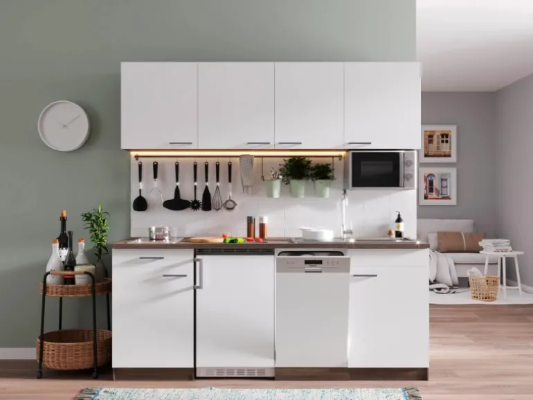 Vier Oberschränke sowie Unterschränke und Schubladen bieten viel Stauraum für Ihre Küchenutensilien und Vorräte. Zudem sind die Zeiten des Abwasches mit dem teilintegrierten Geschirrspüler vorbei. Das Domino-Kochfeld mit zwei Kochzonen, ein Einbaukühlschrank mit drei Sterne Gefrierfach und die Edelstahl Einbauspüle machen die Küchenzeile zum geschmackvollen und funktionellen Einrichtungselement auf kleinem Raum.