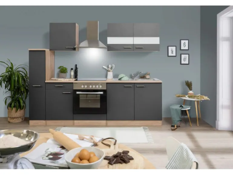 Die Respekta Küchenzeile ist mit einer Breite von 240 cm perfekt für kleinere sowie mittlere Räume und eignet sich ideal auch für Einsteiger und Singlehaushalte. Bestehend aus unter anderem einem Unterschrank mit Schublade sowie Oberschränken bietet die Küche viel Stauraum für all Ihr Geschirr, Gläser und Küchenzubehör. Die mit einer komfortablen Soft-Close Funktion ausgestatteten Türen schließen zudem sanft und leise.