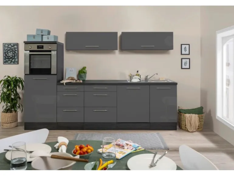 Die modernen Hochglanzfronten in trendigem Grau harmonieren perfekt mit dem Korpus in Eiche Grau. Sie bestechen nicht nur durch ihre Optik, sondern ermöglichen auch eine schnelle und effektive Reinigung. Die Stangengriffe im Edelstahl-Look unterstreichen das geradlinige Design dieser Küche und gewährleisten eine komfortable Bedienung.