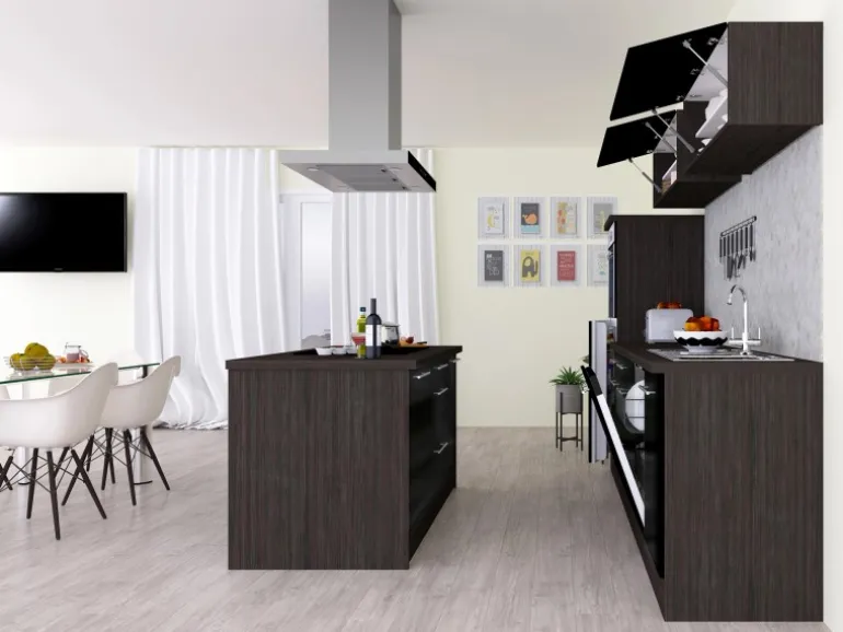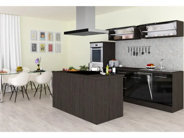 Moderne Küche mit Kochinsel und Hochglanzfronten in Schwarz