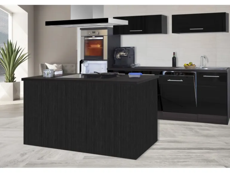 Ausgestattet mit hochwertigen Elektrogeräten lässt diese Küchenzeile keine Wünsche offen. Durch die Kücheninsel, in der auch das Kochfeld enthalten ist, erhalten Sie nicht nur weiteren Stauraum, sondern vor allem zusätzliche Arbeitsfläche. Die leistungsstarke Inselhaube sorgt mit drei Leistungsstufen für perfekten Dunstabzug und beleuchtet das ganze Kochfeld optimal. Der hochgebaute Backofen ermöglicht einen leichteren Zugang, und der integrierte Geschirrspüler erspart Ihnen lästiges Abwaschen per Hand. Neben der Soft-Close-Funktion aller Türen und Auszüge (ausgenommen Kühlschranktür) sorgt die ergonomische Arbeitshöhe von 91 cm für zusätzlichen Komfort.