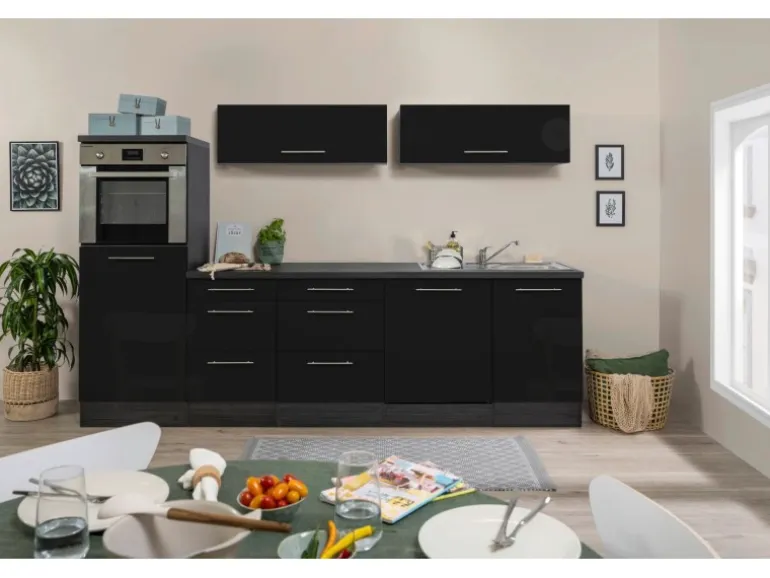 Die modernen Hochglanzfronten in klassischem Schwarz harmonieren perfekt mit dem Korpus in Eiche Grau. Sie bestechen nicht nur durch ihre Optik, sondern ermöglichen auch eine schnelle und effektive Reinigung. Die Stangengriffe im Edelstahl-Look unterstreichen das geradlinige Design dieser Küche und gewährleisten eine komfortable Bedienung.