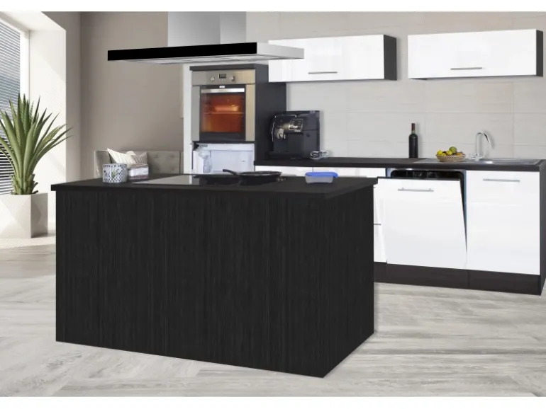 Ausgestattet mit hochwertigen Elektrogeräten lässt diese Küchenzeile keine Wünsche offen. Durch die Kücheninsel, in der auch das Kochfeld enthalten ist, erhalten Sie nicht nur weiteren Stauraum, sondern vor allem zusätzliche Arbeitsfläche. Die leistungsstarke Inselhaube sorgt mit drei Leistungsstufen für perfekten Dunstabzug und beleuchtet das ganze Kochfeld optimal. Der hochgebaute Backofen ermöglicht einen leichteren Zugang, und der integrierte Geschirrspüler erspart Ihnen lästiges Abwaschen per Hand. Neben der Soft-Close-Funktion aller Türen und Auszüge (ausgenommen Kühlschranktür) sorgt die ergonomische Arbeitshöhe von 91 cm für zusätzlichen Komfort.