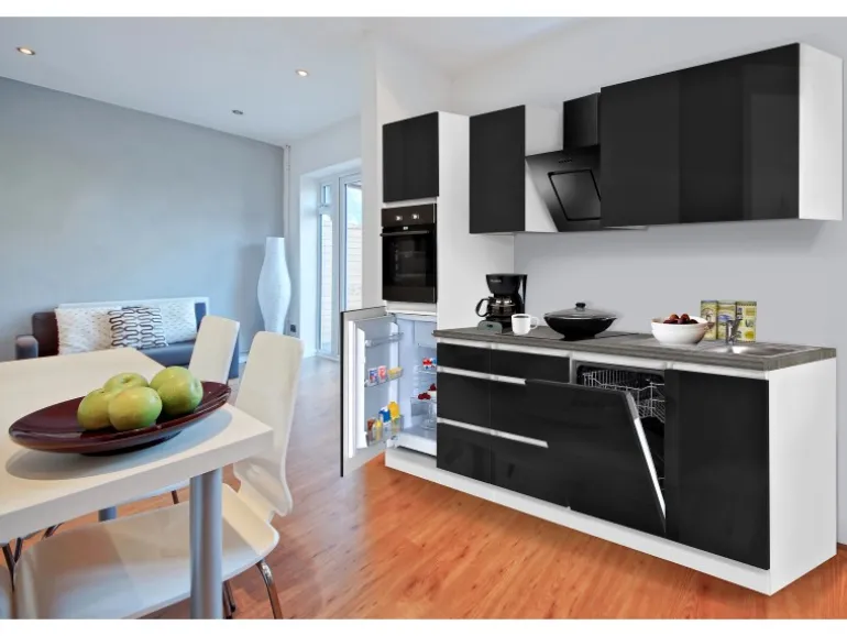 Die Küchenzeile ist mit einer Breite von 280 ideal auch für Einsteiger und Singlehaushalte. Bestehend aus Ober- und Unterschränken sowie einem Hochschrank bietet die Küche viel Stauraum für all Ihr Geschirr, Gläser und Küchenzubehör.
