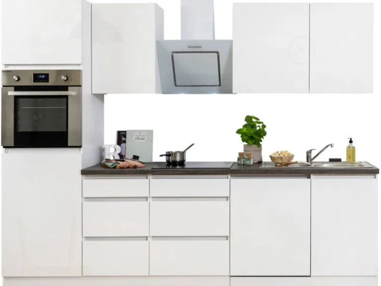 Die Küchenzeile ist mit einer Breite von 280 ideal auch für Einsteiger und Singlehaushalte. Bestehend aus Ober- und Unterschränken sowie einem Hochschrank bietet die Küche viel Stauraum für all Ihr Geschirr, Gläser und Küchenzubehör.