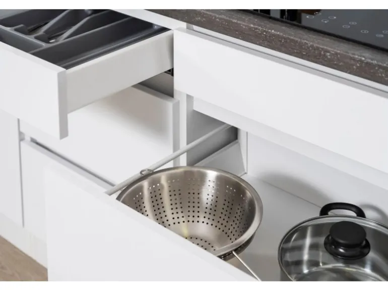 Alle Auszüge und Scharniere mit Soft-Close, Ausnahme Kühleschrank, alle Laufschienen in hochwertiger Metall-Ausführung