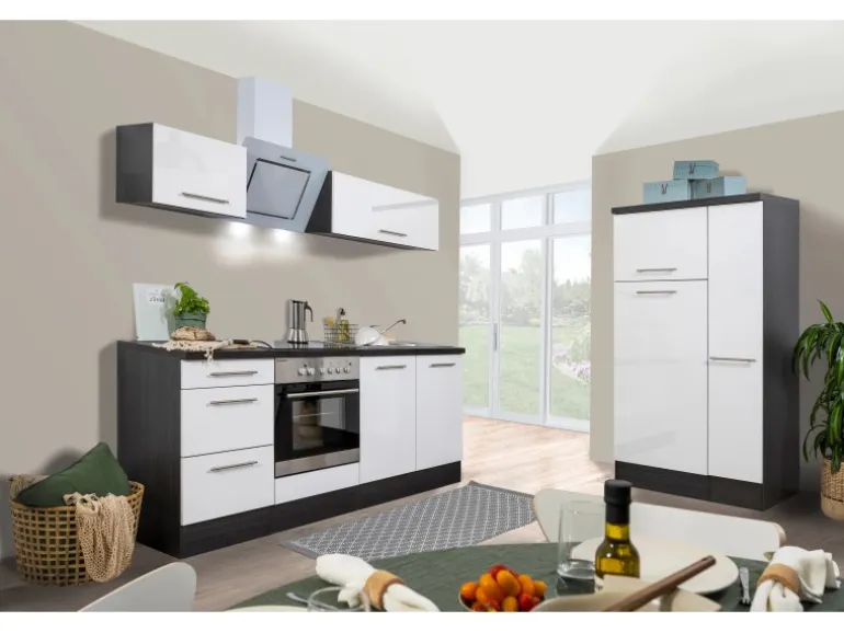 Ausgestattet mit stromsparenden Elektrogeräten lässt diese Küchenzeile keine Wünsche offen. Das Einbauherdset mit Glaskeramikkochfeld und die farblich perfekt integrierte Dunstabzugshaube sorgen für größtmögliches Back- und Kochvergnügen. Die moderne Kopffreihaube bietet viel Bewegungsfreiraum und erleichtert den Zugriff auf die hinteren Kochstellen. In der großen Kühl- und Gefrierkombination finden mühelos all Ihre Lebensmittel und Getränke Platz. Neben der Soft-Close-Funktion aller Türen und Auszüge (ausgenommen Kühlschranktür) sorgt die ergonomische Arbeitshöhe von 91 cm für zusätzlichen Komfort.