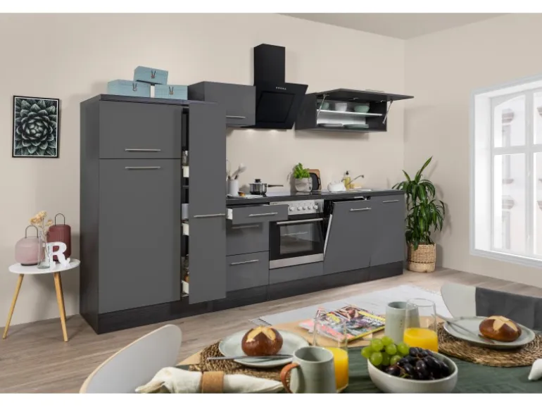 Ausgestattet mit Elektrogeräten lässt diese Küchenzeile keine Wünsche offen. Das Einbauherdset mit Glaskeramikkochfeld und die farblich perfekt integrierte Dunstabzugshaube sorgen für größtmögliches Back- und Kochvergnügen. Die moderne Kopffreihaube bietet viel Bewegungsfreiraum und erleichtert den Zugriff auf die hinteren Kochstellen. In der großen Kühl- und Gefrierkombination finden mühelos all Ihre Lebensmittel und Getränke Platz und der integrierte Geschirrspüler erspart Ihnen lästiges Abwaschen per Hand. Neben der Soft-Close-Funktion aller Türen und Auszüge (ausgenommen Kühlschranktür) sorgt die ergonomische Arbeitshöhe von 91 cm für zusätzlichen Komfort.