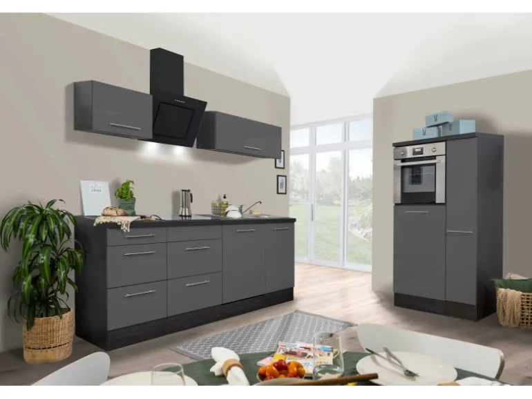 Ausgestattet mit hochwertigen Elektrogeräten lässt diese Küchenzeile keine Wünsche offen. Der hochgebaute Backofen ermöglicht einen leichteren Zugang, und der integrierte Geschirrspüler erspart Ihnen lästiges Abwaschen per Hand. Die Kopffreihaube bietet viel Bewegungsfreiraum und erleichtert den Zugriff auf die hinteren Kochstellen. Neben der Soft-Close-Funktion aller Türen und Auszüge (ausgenommen Kühlschranktür) sorgt die ergonomische Arbeitshöhe von 91 cm für zusätzlichen Komfort.