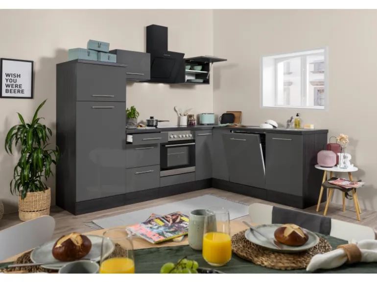 Ausgestattet mit hochwertigen Elektrogeräten lässt diese Küchenzeile keine Wünsche offen. In der großen Kühl- und Gefrierkombination finden mühelos all Ihre Lebensmittel und Getränke Platz und der integrierte Geschirrspüler erspart Ihnen lästiges Abwaschen per Hand. Die Kopffreihaube bietet viel Bewegungsfreiraum und erleichtert den Zugriff auf die hinteren Kochstellen. Neben der Soft-Close-Funktion aller Türen und Auszüge (ausgenommen Kühlschranktür) sorgt die ergonomische Arbeitshöhe von 91 cm für zusätzlichen Komfort.