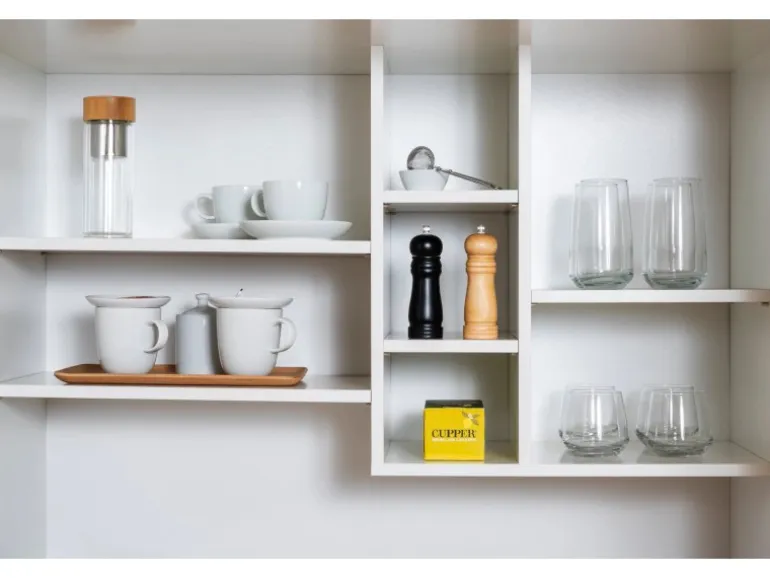 Die matten Türfronten mit ihren dezenten Metallgriffen verdecken gekonnt die komplette Küchenausstattung und sorgen bei geschlossenen Türen sofort für einen aufgeräumten Anblick. Die ansprechende Optik wird durch eine Innenausstattung in neutralem Weiß abgerundet. Die Oberflächen sind ausgesprochen reinigungsfreundlich und sind daher besonders praktisch.