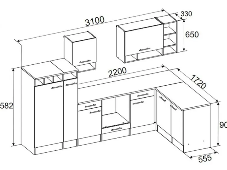 Die Respekta Küchenzeile eignet sich mit ihren Abmessungen von 310 x 172 cm ideal auch für größere Familien. Bestehend aus unter anderem je einem 50 cm und einem 80 cm breiten Hängeschrank, einem Herdumbauschrank mit Klapptür und einem Unterschrank mit Schublade bietet diese Küche ausreichend Platz für all Ihre Küchenutensilien. Ein besonderes Highlight dieser Küche ist der trendige Apothekerschrank. Er ist von beiden Seiten zugänglich und wirkt wie ein kleines Raumwunder. Mit einer Breite von 30 cm und drei Innenfächern schafft er viel übersichtlichen Stauraum für Ihre Vorräte.