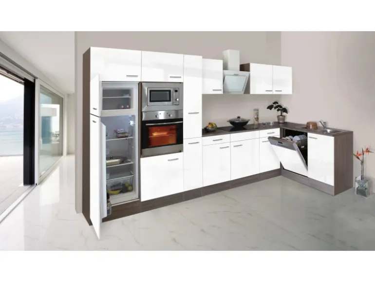 Der teilintegrierte und energieeffiziente Geschirrspüler vermeidet das lästige Abwaschen des Geschirrs per Hand. Die Kombination aus Kühlschrank und Gefrierfach bietet ausreichend Stauraum für Lebensmittel und Getränke. Weiterhin ist die Winkelküche mit einem autarken Backofen und Glaskeramikkochfeld sowie einer Einbaumikrowelle und einer Einbauspüle aus Edelstahl ausgestattet. Die Küche lässt sich ganz nach Ihren Wünschen wechselseitig aufbauen. Alle Holzteile sind zerlegt und eignen sich dank einer detaillierten Aufbauanleitung zur einfachen Selbstmontage.
