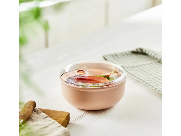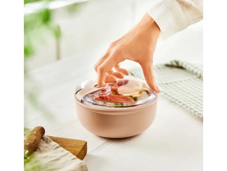 Die Transparenz des Deckels erlaubt es, den Inhalt zu sehen, ohne die Box öffnen zu müssen. Dank des schönen Designs der Box kann sie auch direkt auf dem Tisch als Schale verwendet werden. Zum Aufwärmen der Speisen kann die Box ohne Deckel in die Mikrowelle gestellt werden. Sowohl der Deckel als auch die Box sind für die Spülmaschine geeignet