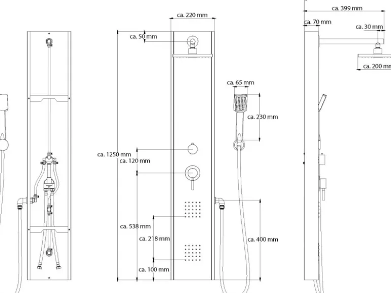 Duschpaneel mit Kopfbrause, Handbrause, Einhebelmischer und 2 Massagedüsen