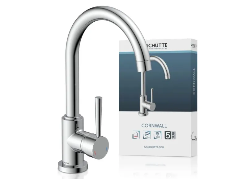 Die hochwertige Schütte Spültischarmatur Cornwall überzeugt durch das moderne Design und setzt tolle Akzente in Ihrer Küche. Die Standarmatur mit hohem Rundbogenauslauf und 360° Schwenkbereich sorgt für einen umfangreichen, komfortablen Aktionsradius. Dank der Einhebel-Bedienung haben Sie mehr Bewegungsfreiheit am Spülbereich. Die Hochdruck-Armatur ist mit einer geräuscharmen, auswechselbaren Kartusche mit langlebigen, keramischen Dichtungen zur präzisen Regelung der Durchflussmenge und der Wassertemperatur ausgestattet. Dank der Cold-Start-Funktion wird bei Hebel-Mittelstellung nur der Zufluss von Kaltwasser ermöglicht und Sie sparen Energie. Zudem verfügt die Armatur über einen Kalt- und einen Warmwasseranschluss und wird inklusive zwei Flexschläuche geliefert. Strenge Qualitätskontrollen und hochwertige Materialien, die den Bestimmungen der deutschen Trinkwasserverordnung entsprechen, gewährleisten hohe Sicherheit und beste Wasserqualität. Das mitgelieferte Montageset und die leicht verständliche Montageanleitung garantieren eine schnelle und einfache Installation.