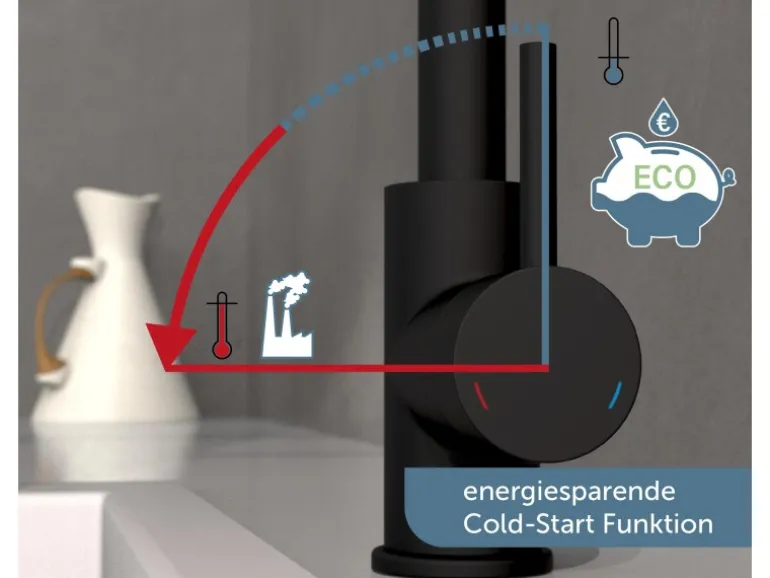 Die Einhebel-Mischbatterie verfügt über eine Cold-Start-Technik, die den Wasserfluss bei senkrechter Position des Bedienhebels auf Kaltwasser beschränkt, was oft ausreichend ist. Die Eco-Click-Funktion mit zweistufigem Bedienhebel ermöglicht es, den Wasserauslauf zu reduzieren.