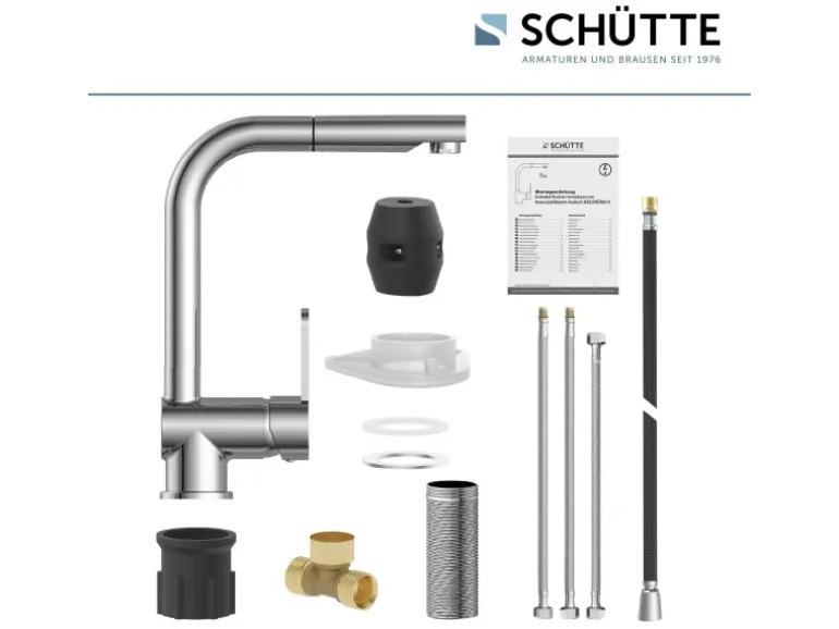 Lieferumfang Ein vollständiges Montageset und eine mehrsprachige, bebilderte Montageanleitung. Die korrosionsbeständigen Anschlussschläuche (400 mm) an das Hauswassersystem sind aus einem flexiblem Metallgewinde und einfach in der Montage.