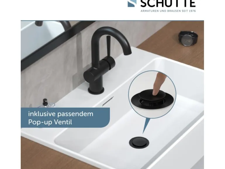 Der Wasserhahn Bad verfügt über eine Waschbecken Ablaufgarnitur mit Pop Up Ablaufventil. Bequem per Fingerdruck den Abflussstopfen öffnen und schließen. Passend zu allen Waschtisch-Siphons mit 1 1/4 – Ø ca. 4 cm Anschluss.
