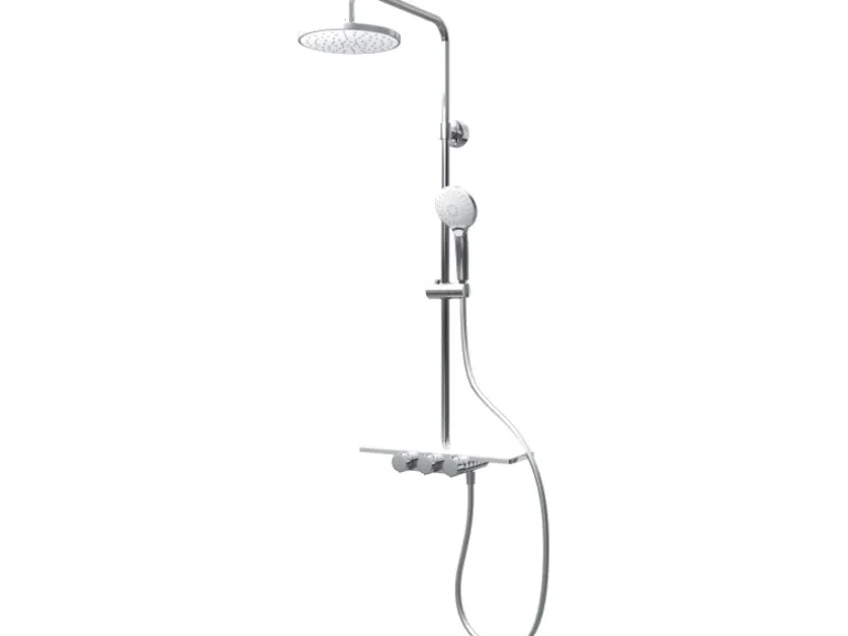 Die große, runde Tellerkopfbrause simuliert eine angenehme Regendusche und lädt zum Entspannen ein, während die klassische Handbrause verschiedene Grade des Wasserdrucks anbietet. Die Bedienung gelingt ganz einfach über Drücken oder Drehen der Elemente. Darüber hinaus bietet die praktische, integrierte Ablage ausreichend Platz für Ihre Dusch- und Pflegeprodukte, sodass Sie diese stets griffbereit haben. Der Korpus besteht aus Messing mit verchromter Oberfläche.