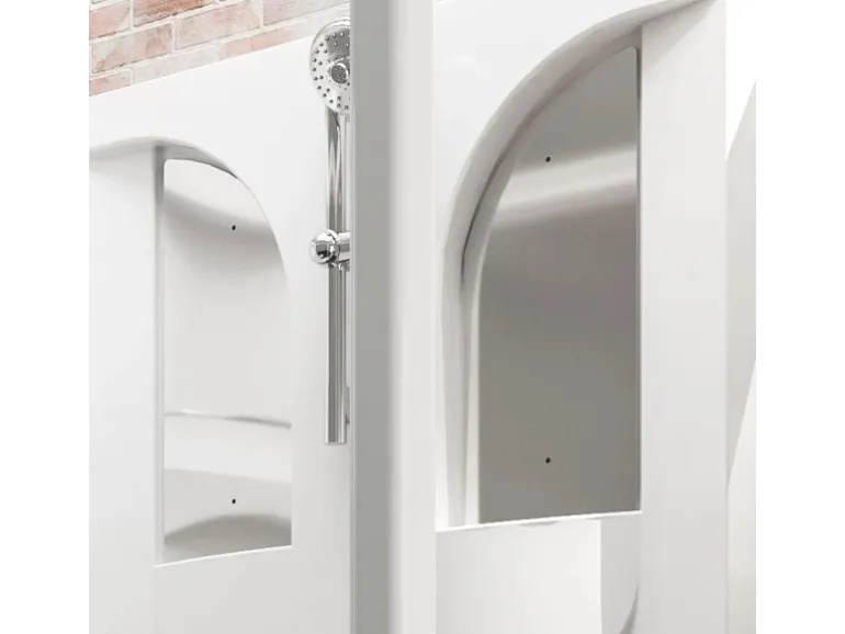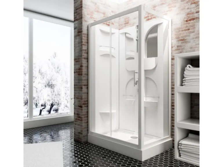 Die Komplettduschkabine Malta besteht aus einer Schiebetür, einem Festelement, einer Rückwand und einer Seitenwand. Das Festelement ist mit einem integrierten Sitz ausgestattet (wahlweise rechts oder links montierbar). Die Rückwand besitzt eine Duschstangengarnitur mit Einhebelmischer und 3 Ablageflächen. Eine Duschwanne mit integrierter Schürze und Ablauf gehört zum Lieferumfang.