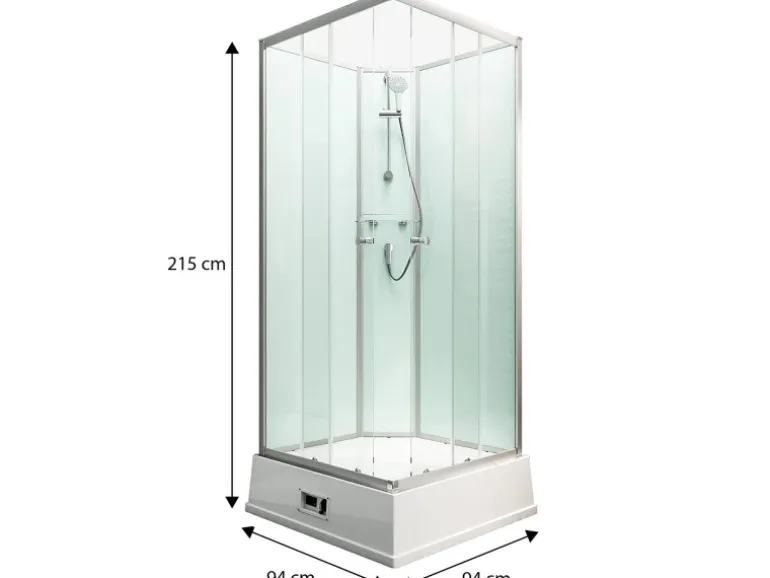Die Komplettdusche verfügt über eine integrierte Pumpe und einen integrierten Boiler und benötigt daher nur einen Kaltwasseranschluss, einen separaten 230 Volt Stromanschluss und eine Möglichkeit der Entwässerung für den Betrieb. Der Boiler fasst ein Volumen von 18 l und verfügt über eine Heizleistung von 2 kW. Die Duschkabine kann ohne große Vorinstallationen schnell und einfach aufgebaut werden und ist sofort betriebsbereit. Dank der praktischen Steckmontage lässt sich die gesamte Duschkabine innerhalb von 20 Minuten zusammenbauen und ist sofort einsatzbereit.