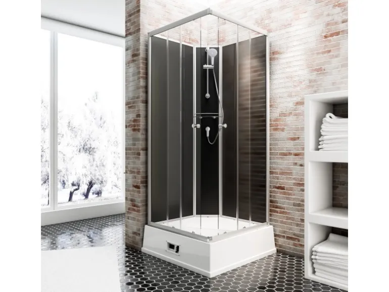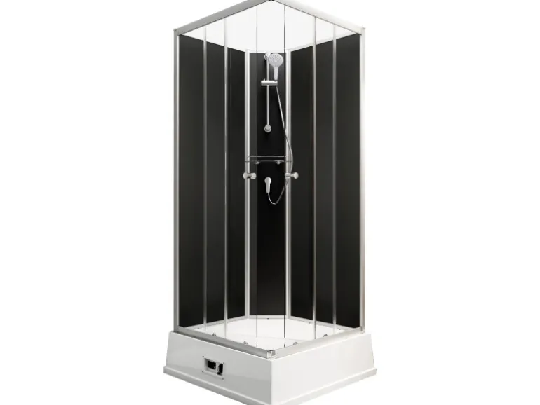 Die Duschkabine wird inklusive der großzügigen Duschwanne aus Sanitäracryl mit integrierter Schürze, Ablauf und Abwasserpumpe geliefert. Auch die Duscharmaturen, bestehend aus Duschstange, Duschkopf und Einhebelmischer, ist im Lieferumfang enthalten. Des Weiteren ist in der Duschkabine eine praktische Ablage verbaut, die fest am Rückwandpaneel befestigt ist. Die vielseitige Ausstattung der Duschkabine ermöglicht ein entspanntes Duscherlebnis und sorgt dafür, dass die Dusche sofort einsatzbereit ist. Alle Teile der Duscharmatur sind aus hochwertigem Aluminium gefertigt.