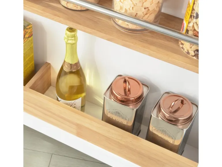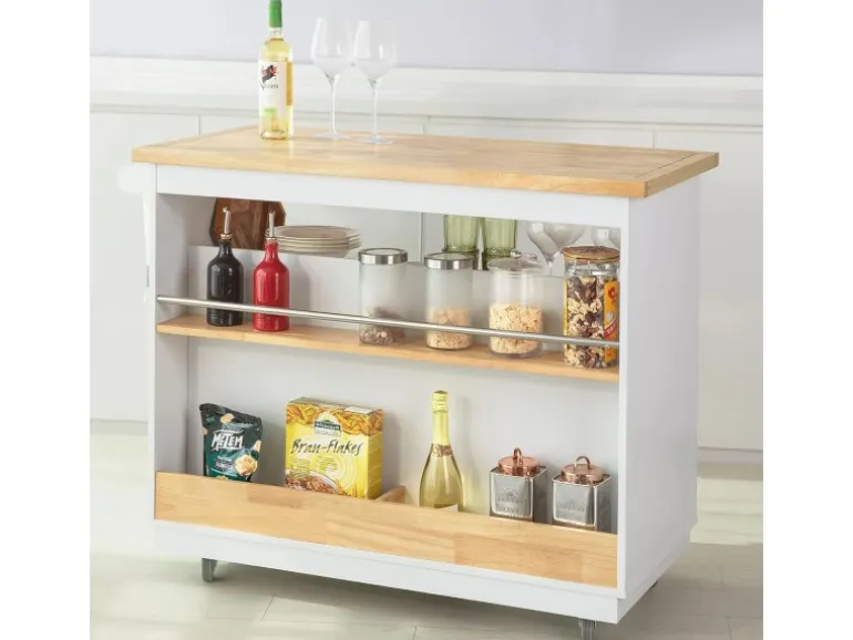 Dieser Küchenwagen verfügt über viele offene Fächer und zwei Schubladen, wo Sie viele Utensilien verstauen können.
