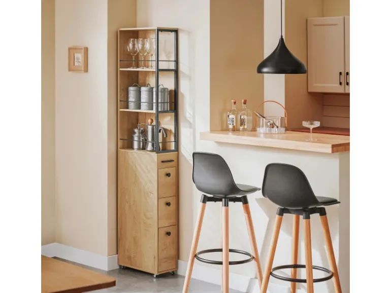 Die Rollen an der Unterseite ermöglichen ein müheloses Verschieben, während die robusten Schubladen mit ihren schwarzen Griffen reichlich Stauraum für Badutensilien oder Küchenzubehör bieten.