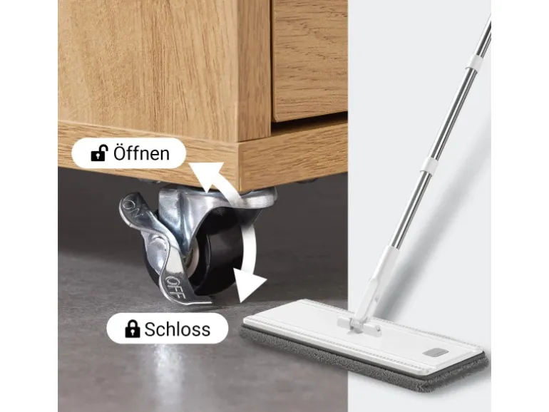 Dieser Schrank ist mit Rollen ausgestattet, um bei Bedarf flexibel und leicht beweglich zu sein.