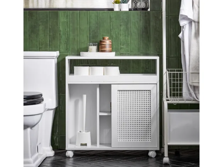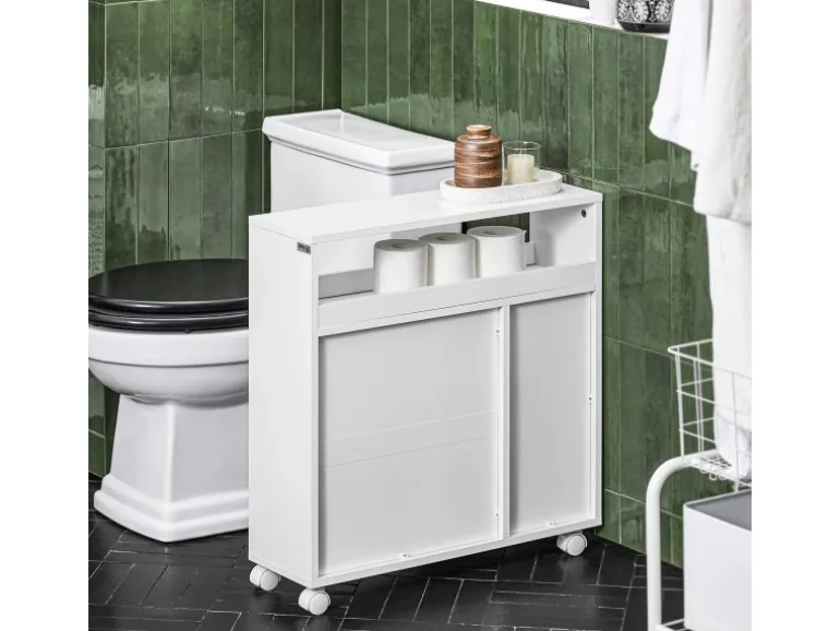 Ein offenes Fach und zwei Schiebetüren bieten eine Menge Stauraum für Ihre Gewürze, Badeutensilien, usw. Toilettenbürsten und Papierhandtücher haben eine eigene Aufbewahrung.