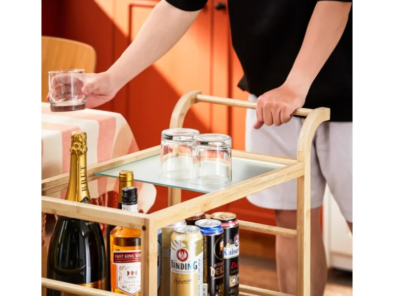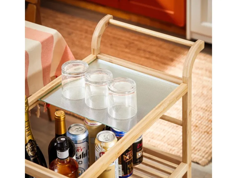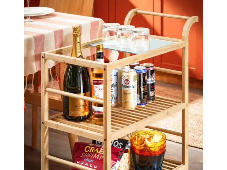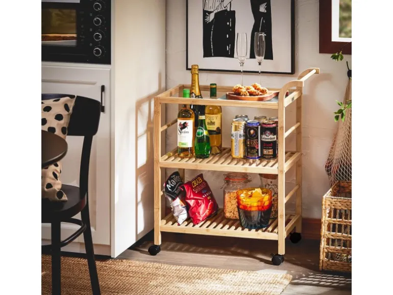 Dieser Küchenwagen aus Gummi-Holz ist stabil und bietet sehr viel Stauraum für verschiedenste Utensilien in Ihrer Küche.