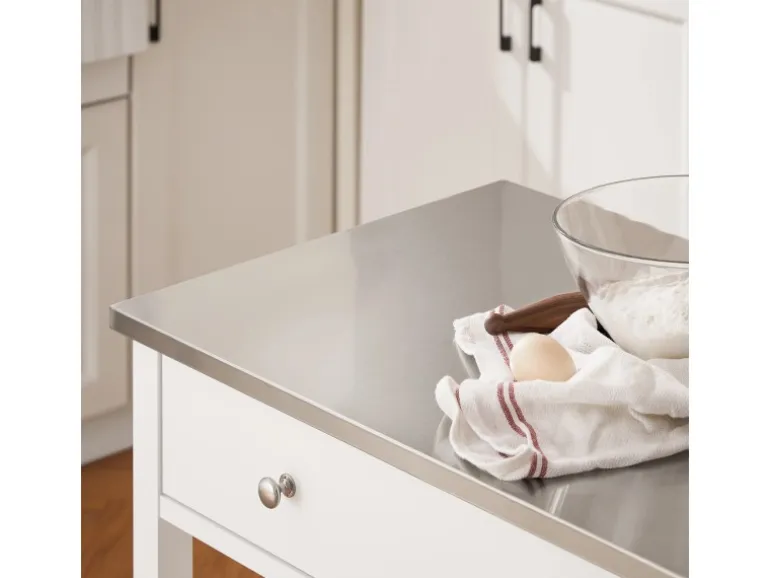 Die Kombination aus Weiß-Platte und Edelstahl-Arbeitsplatte verleiht dem Beistelltisch einen eleganten Look – passt ideal in Küche, Wohnung oder Outdoor-Bereich.