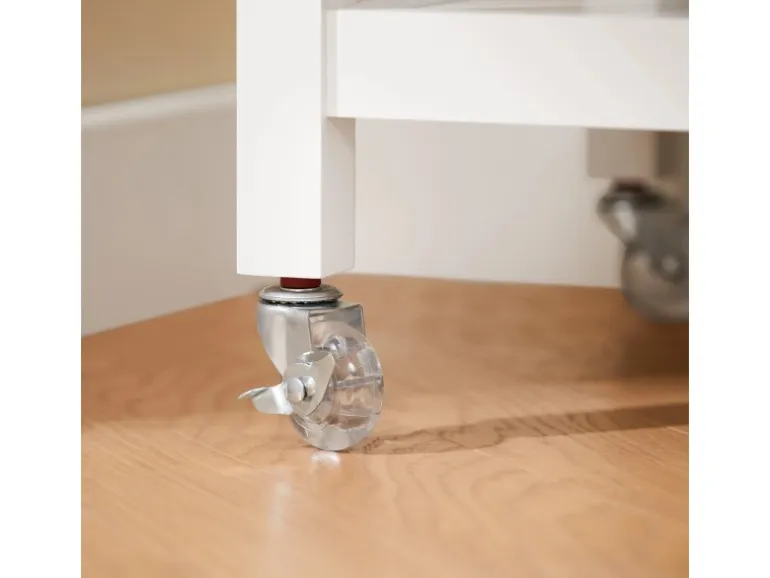 Vier 360° Rollen, davon zwei mit Bremsen, kombiniert mit stabilen Kiefernholzbeinen, sorgen für Mobilität und festen Halt – ein robuster Rollwagen Küche.
